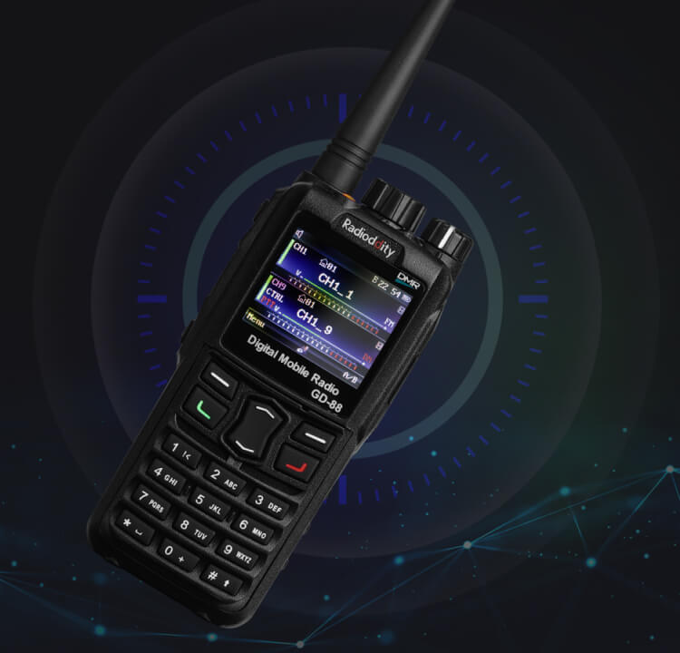 The Radioddity GD-88 is a powerful handheld radio with a compact design, featuring selectable output power of 7W/2.5W and storage for up to 300,000 DMR contacts, which can be bulk imported via software.